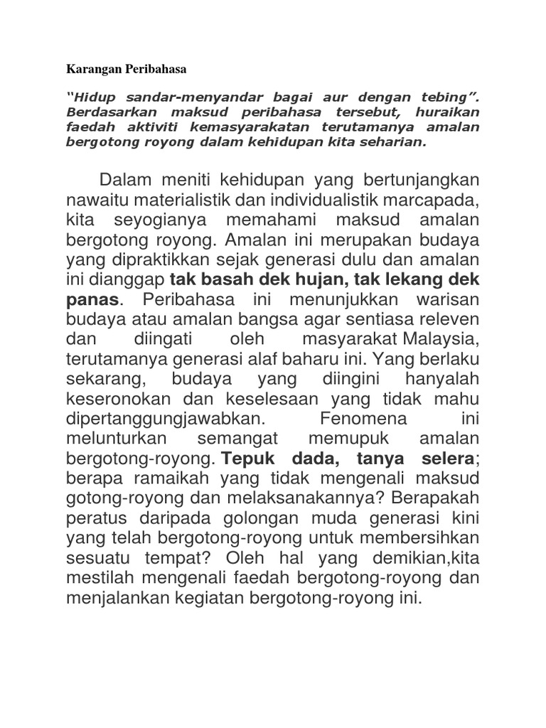 Kamu mengikut ibu pergi ke pasar malam Tuliskan sepucuk surat kepada kawan untuk menceritakan pengalaman kamu. Diharapkan ia tidak menjadi seperti peribahasa Melayu yang dikejar tidak dapat yang dikendong berciciran. Bak kata peribahasa bagai aur dengan tebing Dengan itu kerjasama yang erat antara negara-negara jiran membantu Malaysia untuk menikmati satu tahap keamanan yang tinggi.